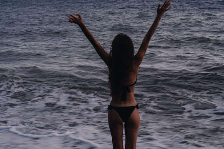 Back view of beautiful young woman in bikini standing in water and enjoying sunset
