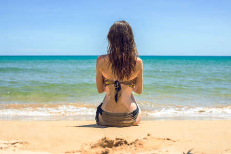 Back view of beautiful girl in bikini and sunglasses relaxing on the tropical sandy beach during summer holiday