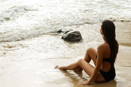 Side view tanned slim girl with sexy booty in black bikini sits on sandy beach and looks at ocean