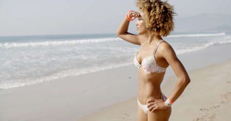 Young seductive african american girl near the sea, whirls and plays the fool in