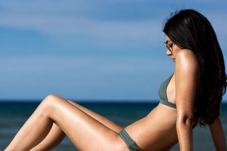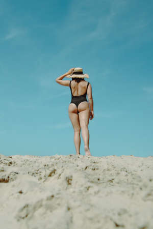 Portrait of pretty beautiful fashion woman in black bikini posing in summer near the sea and blue sky. Young Girl with tanned sexy body in swimwear with copy space. Summer lifestyle. Vacation
