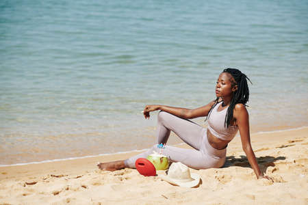 Attractive young slim woman sitting on beach with coconut cocktail and looking at beautiful seascape