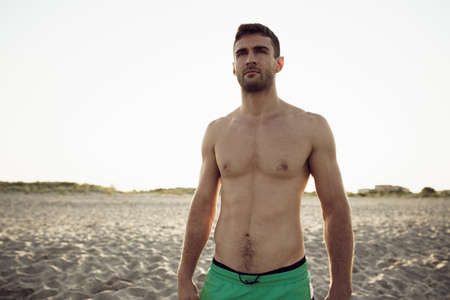 portrait of happy young african man on the beach.Handsome and confident Masculine hard fitness model male body bodybuilder with six pack.India trainer with perfect abs, shoulders,biceps, triceps,chest