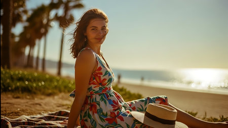 Beautiful young woman in dress and hat sitting on the beach at sunset