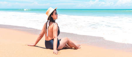 Young girl in bikini sits on a beach by the sea. Portrait of young pretty woman with hat sitting on the beach