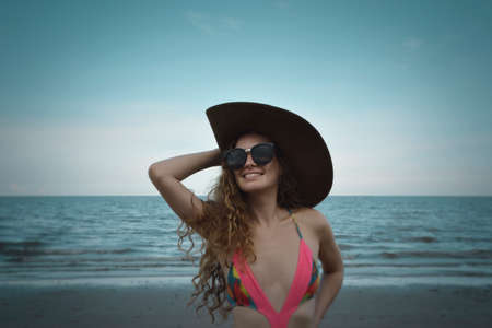 A Young Beautiful woman in Bikini enjoying and relaxing on the beach, Summer, vacation, holidays, Lifestyles concept.