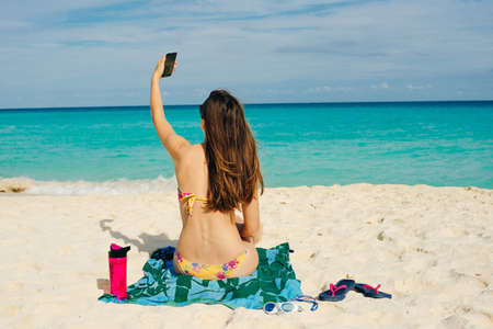 Summer vacation. Sexy girl in bikini sunbathing tanning on the beach. Young woman relaxing with mobile phone on the sea coast. Summertime.