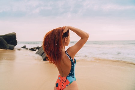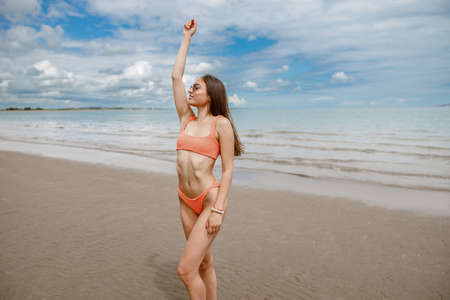 Sexy woman at beach in swimsuit with ideal fitness body on background of ocean. Vacation concept
