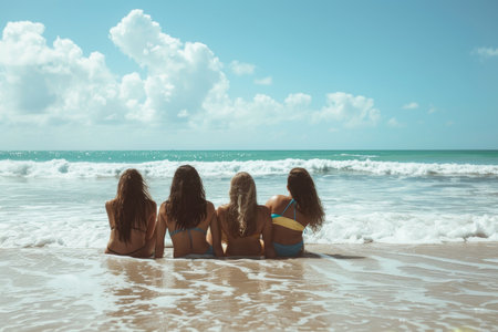 A group of friends, all girls, sit together on the sandy beach, gazing out at the vast ocean on a sunny day, Friends enjoying a sunny day at the beach