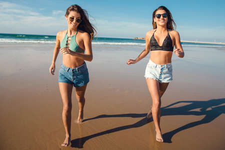 Young slim athletic long hair sensual woman in sportswear on the sea beach in the morning, healthy lifestyle