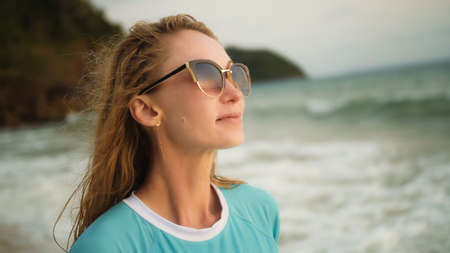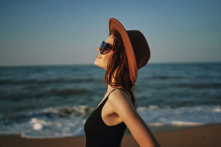 Natural beauty woman walking and relax on beach. Warm golden sunset. Woman with birthmark in blue swimsuit and sunglasses