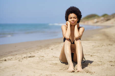 Full body of African American female traveler in swimwear looking at camera while sitting on sandy coast near sea during summer vacation in tropical resort