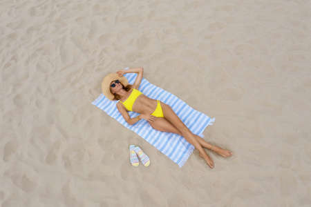 Woman sunbathing on beach towel at sandy coast, aerial view