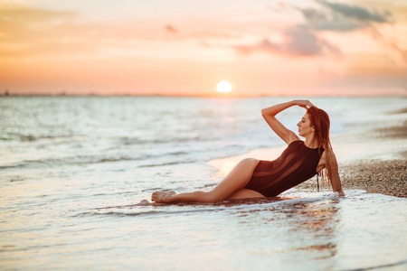 Sexy woman on beach sand posing in bodice swimwear, toned photo