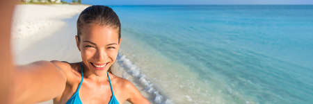 Selfie Asian woman relaxing on beach vacation smiling at camera taking photo in bikini woman on summer holiday in swimsuit. Banner panoramic swimsuit model girl.