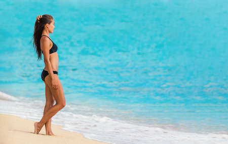 Asian bikini body woman going swimming in Caribbean ocean on beach vacation. Beautiful swimsuit model with lean legs and body profile wearing black swimwear on blue background
