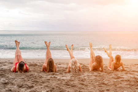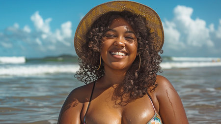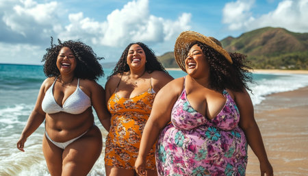 Joyful plus size women embrace the sun and sand at the beach, celebrating body positivity