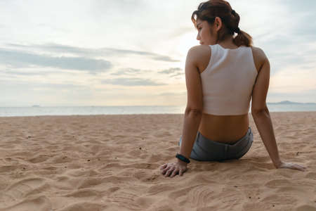 Woman is stretching doing yoga on the sand beach with waves, back view.