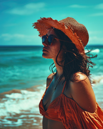 Beautiful young woman in hat and sunglasses on the beach. Toned.