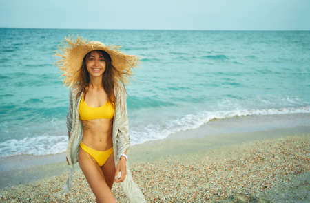 Trendy stylish bikini girl in big straw hat on seaside, smiling to camera. Brunette tanned girl in yellow swimwear enjoying walk on send beach by ocean