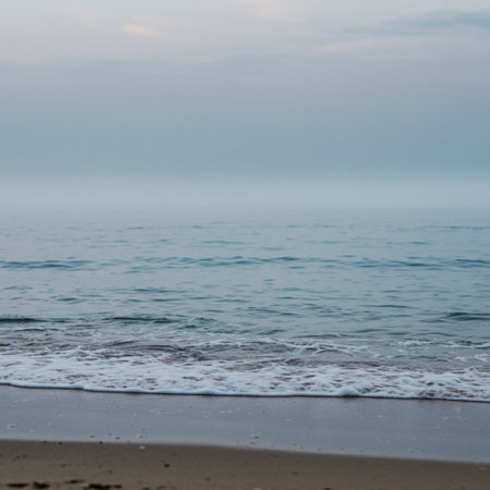 A tranquil seascape features soft waves lapping against a sandy shore under a foggy sky, evoking a sense of peace and natural beauty at the ocean.