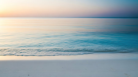 Breathtaking view of a tranquil beach with gentle waves lapping the shore captured during the soft ethereal light of dawn or dusk
