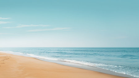 A serene seascape featuring a calm ocean with soft waves breaking on a golden sandy beach, under a vast, clear blue sky.