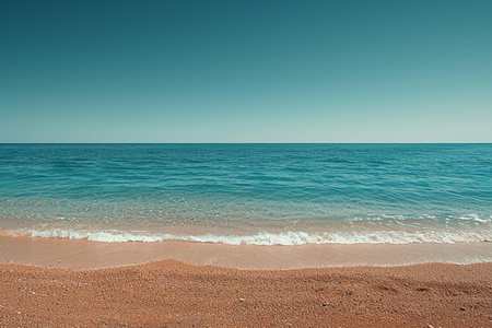 A picturesque view of gentle waves washing ashore on a sandy beach under a clear blue sky, capturing the essence of tranquility and natural beauty.