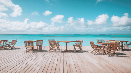 Experience tranquility at a beautiful beachfront dining area featuring wooden tables and chairs, perfect for enjoying the stunning views of turquoise waters.