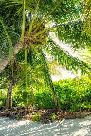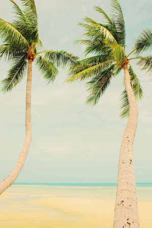 Coconut palms on a tropical island. Coconut palm trees, peaceful nature serene view. Tropical landscape beach, exotic island untouched. Vintage colors