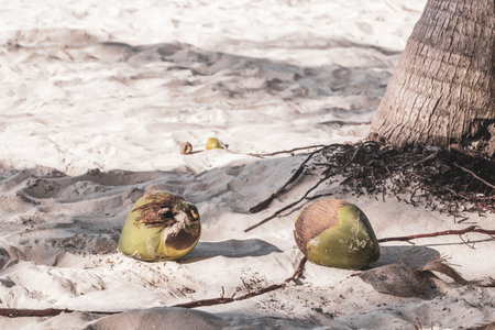 Coconut on the sand on the Caribbean beach in Playa del Carmen Quintana Roo Mexico.