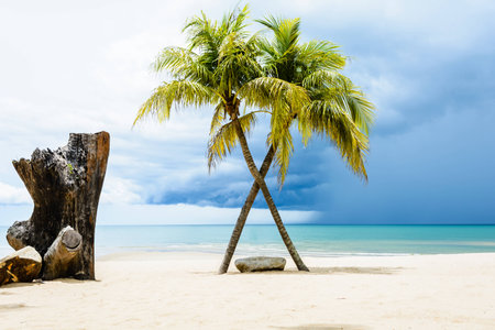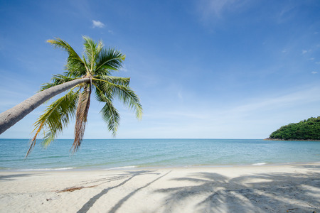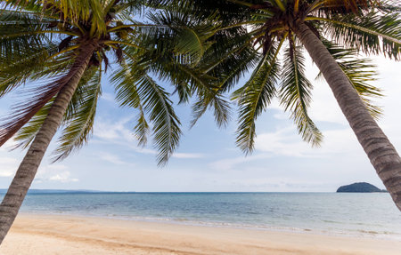 Summer landscape on tropical Koh Kood island in Thailand. Panorama of white sand beach with coconut palms taken on Klong Chao.