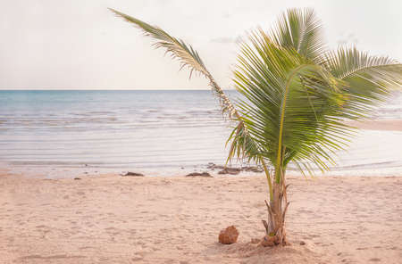 Single newling palm tree growing on white sand beach, blue sky and sea background.