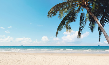 Palm tree on tropical beach with blue sky and white clouds abstract background. Copy space of summer vacation and business travel concept. Vintage tone filter effect color style.