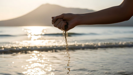 A hand lets sand fall into the ocean near a mountain at sunset.