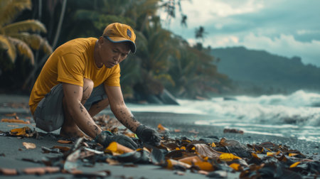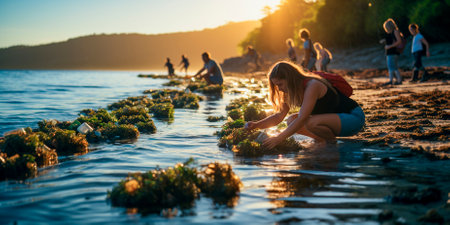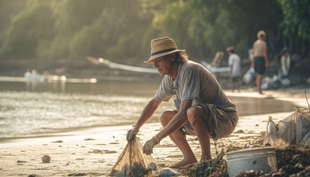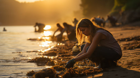 Environmental volunteers work together to clean up beaches and protect the planet. Fight ocean pollution and promote environmental protection. Dedicated activists