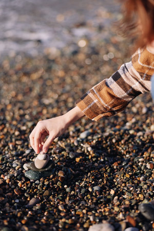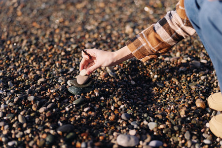 Close up of a hand in plaid sleeve placing a small pebble on a rocky beach, highlighting texture and natural detail with calm water in the background