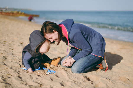 Young woman playing at sea sand beach background with little cute child baby boy, good mood. Mother, little kid son on sunny day. Parenthood, family holiday 15 of may, love, parents, children concept