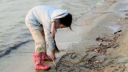 Boy in yellow rubber boots playing with stick and sand at the beach. School kid touching water at autumn winter sea. Child having fun with waves at the shore. Spring Holiday vacation concept.