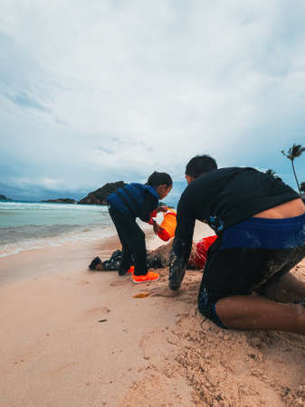 Two Asian Thai girls are digging the sand to find shell on the beach coast of Rayong, Thailand in vintage color