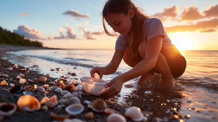 A young girl collects seashells along a tranquil beach at sunset, enjoying natures beauty and the sounds of gentle waves