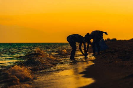 A group of volunteers collects trash on the beach. Protecting the planet through environmental activism. Fighting ocean pollution and promoting ecology.
