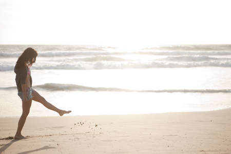 Teenage girl playing soccer on the beach in the evening at sunset