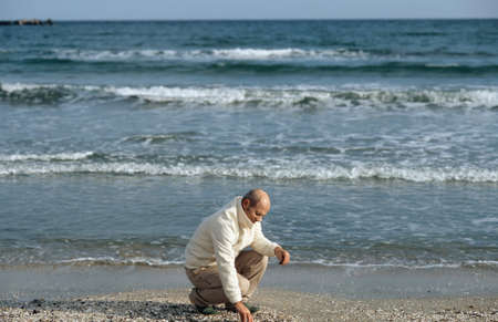 Black hair guy in dark suit sitting on the beach look at the shell in his hand, horizontal.