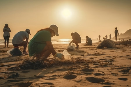 Volunteers cleaning up plastic waste from a polluted beach, showing efforts to combat environmental pollution Generative AI