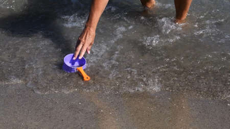 Hand catches plastic toy pot from water. Leisure game with floating toy lost in sea surf of coastline and swimming in clear sea water on wet sand of beach shore