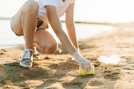 Eco-conscious Woman collects plastic waste on sandy beach