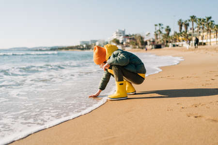 Boy in yellow rubber boots playing with water and sand at the beach. School kid touching water at autumn winter sea. Child having fun with waves at the shore. Spring Holiday vacation concept.