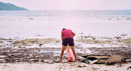 Woman volunteer collects garbage on the beach, Save earth concept, Environmental pollution.