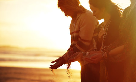Its ok to live a life that others dont understand. three gypsies holding sand in their hands on the beach.